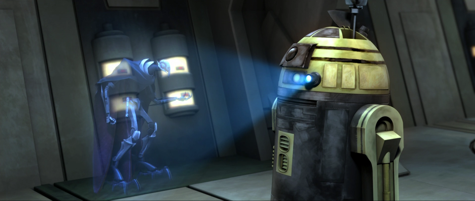 Gha Nachkt accesses R2-D2's memory bank and finds that the little droid contains every Republic strategy. Although the holographic displays are replete with Aurebesh characters, the text ultimately amounts to mere gibberish.[1]