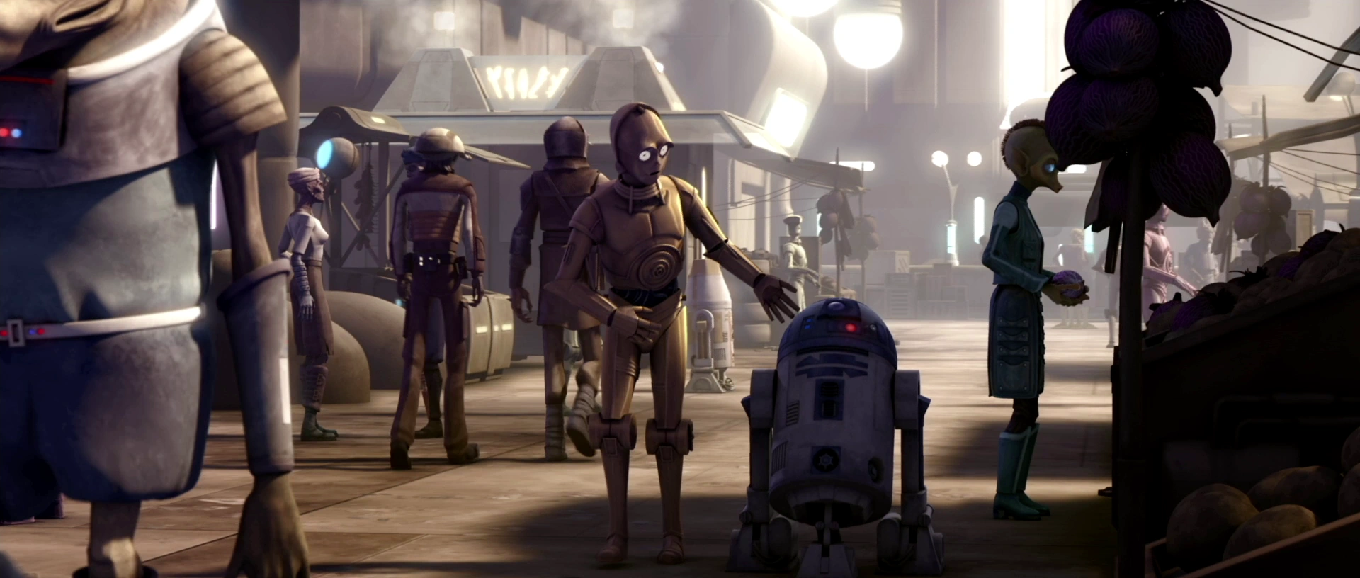 When the speeder brings C-3PO to Cad Bane, Bane is standing in front of a billboard which says "VIDEO STORE" and "KL FKJ G[obscured]" – "FAD FA[obscured]". Parts of another sign can be glimpsed near him, and another advertisement in the background (barely readable) shows Aurebesh gibberish.