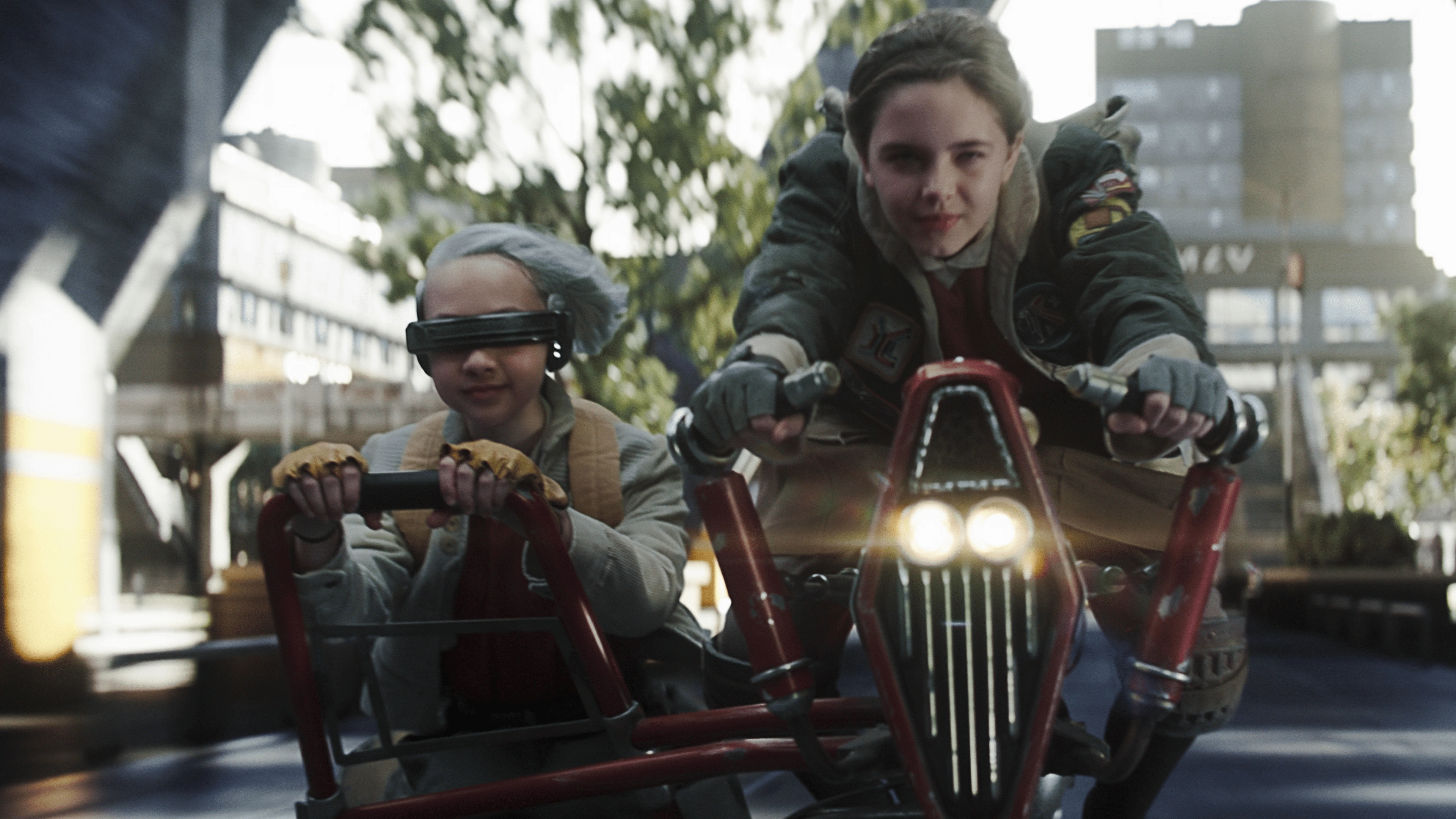 The two girls then race down the underpass, where two signs positioned above the entrance read "BENDER MILE". There is a word located above the name, but it is not legible. As they make their way out of the tunnel, there is an Aurebesh sign suspended from the ceiling; however, its clarity is insufficient for reading. In the shot depicting their emergence from the underpass, two distinct signs on an adjacent building display the word "UNIT"; curiously, the letters are mirrored, yet the order of the characters remains intact. Meanwhile, the exit features two different signs that state "BENDER"; unfortunately, its placement at a distance renders it hard to read. A third exit sign advises "CAUTION".